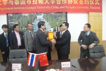 พิธีลงนามบันทึกข้อตกลงความร่วมมือทางวิชาการในการแลกเปลี่ยนนิสิต อาจารย์ และงานวิชาการด้านอื่น ๆ ระหว่าง มหาวิทยาลัยบูรพา Guangxi University และGuangxi University of Finance and Economics นำโดย ศาสตราจารย์นายแพทย์สมพล พงศ์ไทย อธิการบดีมหาวิทยาลัยบูรพา พร้อมด้วย ศ.ดร.สุชาติ อุปถัมภ์