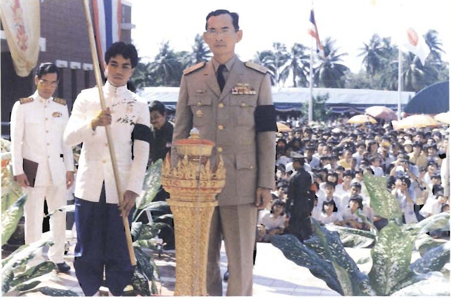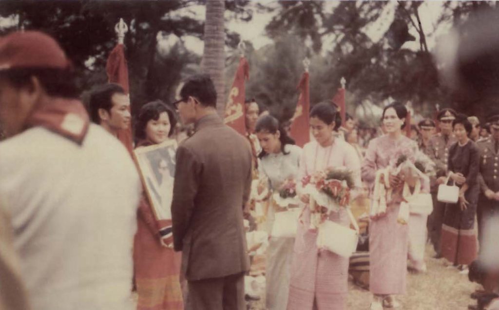 พระบาทสมเด็จพระเจ้าอยู่หัว เสด็จพระราชดำเนินพร้อมด้วยสมเด็จพระนางเจ้าพระบรมราชินีนาถ สมเด็จพระเทพรัตนราชสุดา สยามบรมราชกุมารี และสมเด็จพระเจ้าลูกเธอเจ้าฟ้าจุฬาภรณ์ ไปยังพลับพลาในการพระราชทานธงลูกเสือชาวบ้าน และทรงเยี่ยมราษฎร จังหวัดชลบุรี เมื่อวันที่ ๓๐ มิถุนายน พ.ศ. ๒๕๑๙