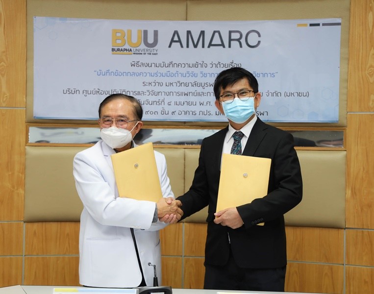 รองศาสตราจารย์ ดร.วัชรินทร์ กาสลัก อธิการบดีมหาวิทยาลัยบูรพา และรองศาสตราจารย์ นพ.วิรัตน์ วงศ์แสงนาค ประธานกรรมการบริษัทศูนย์ห้องปฏิบัติการและวิจัยทางการแพทย์ และการเกษตร แห่งเอเชีย จำกัด (มหาชน) เป็นประธานลงนามข้อตกลงความร่วมมือฯของแต่ละฝ่าย พร้อมด้วยผู้บริหาร คณะวิทยาศาสตร์ ประกอบด้วย