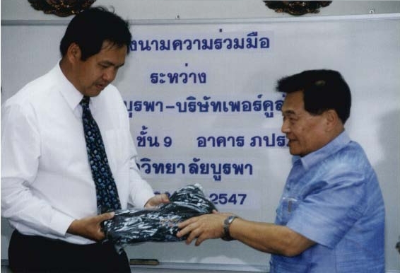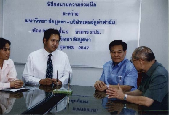 พิธีลงนามบันทึกข้อตกลงความร่วมมือทางวิชาการ ระหว่าง มหาวิทยาลัยบูรพา กับ บริษัทเพอร์คูล่าฟาร์ม เมื่อวันที่ 26 ตุลาคม พ.ศ. 2547 ณ ห้อง 922 ชั้น 9 อาคาร ภปร. มหาวิทยาลัยบูรพา