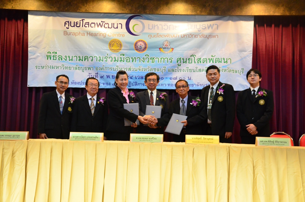 มหาวิทยาลัยบูรพา ผู้ช่วยศาสตราจารย์ นพ.วิชิต ชีวเรืองโรจน์ รองประธานราชวิทยาลัยโสต ศอ นาสิกแพทย์แห่งประเทศไทย รองศาสตราจารย์ พญ.เสาวรส อัศววิเชียรจินดา คณะแพทย์ศาสตร์ จุฬาลงกรณ์มหาวิทยาลัย รองศาสตราจารย์ นพ.เพิ่มทรัพย์ อิสีประดิฐ คณะแพทย์ศาสตร์ จุฬาลงกรณ์มหาวิทยาลัย ได้ร่วมลงนามความร่วมมือทางวิชาการคืนเด็กโสตฯสู่สังคม และพิธีเปิดศูนย์โสตพัฒนา ณ โรงแรมเทา-ทอง มหาวิทยาลัยบูรพา เมื่อวันที่ 9 พฤศจิกายน พ.ศ. 2554 ณ โรงแรมเทา-ทอง มหาวิทยาลัยบูรพา