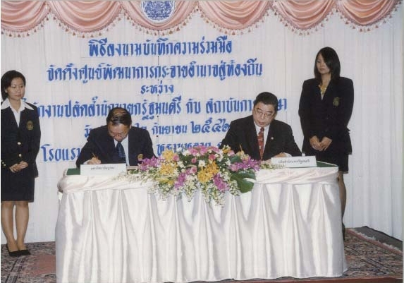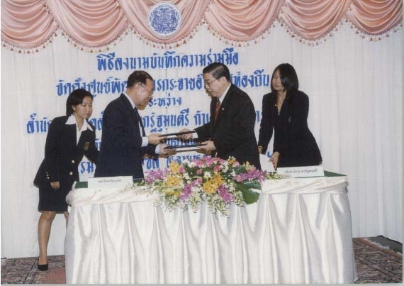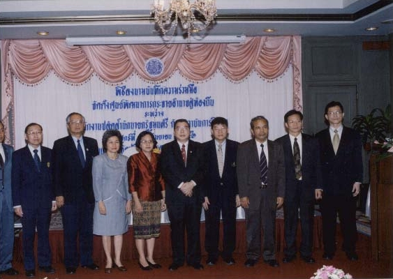 พิธีลงนามบันทึกข้อตกลงความร่วมมือทางวิชาการจัดตั้งศูนย์พัฒนาการกระจายอำนาจสู่ท้องถิ่น ระหว่าง สำนักงานปลัดสำนักนายกรัฐมนตรี กับ สถาบันการศึกษา เมื่อวันศุกร์ ที่ 2 กันยายน 2546