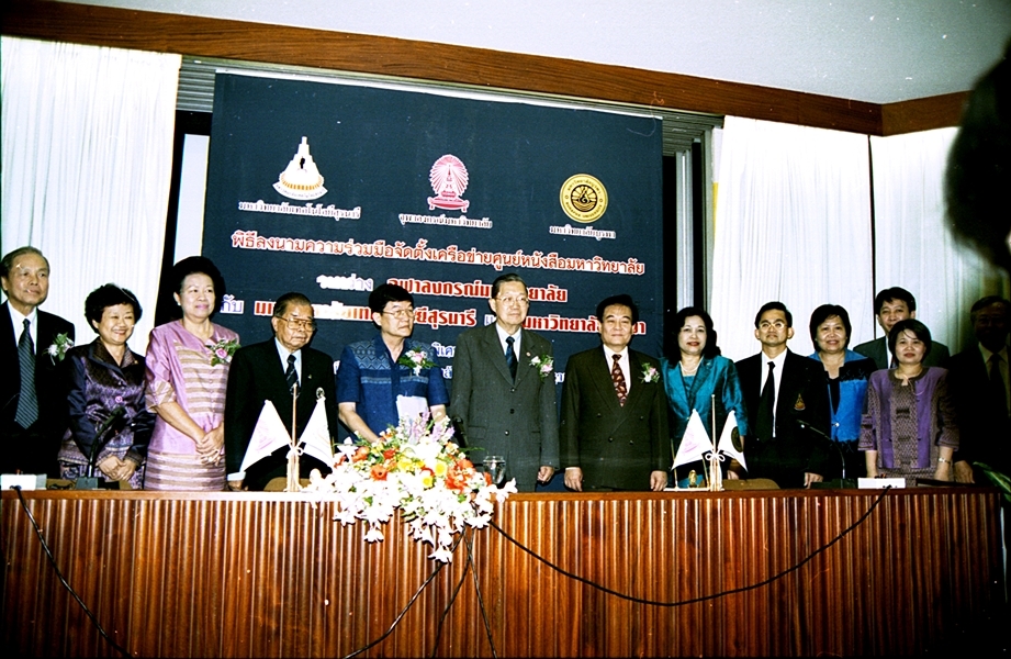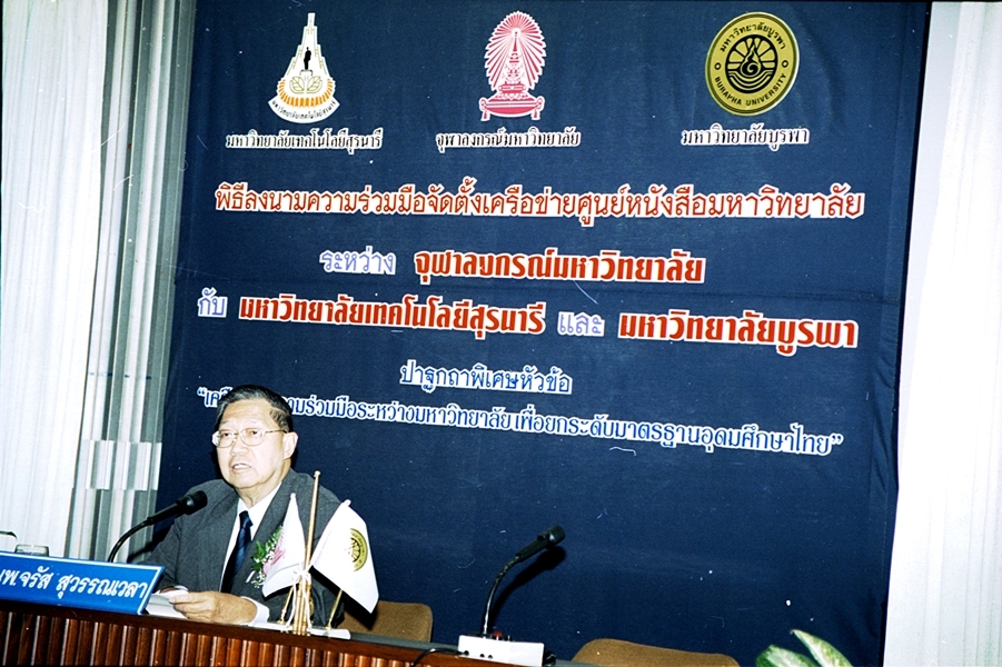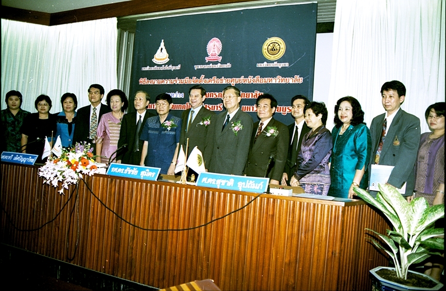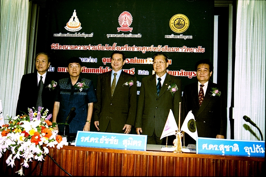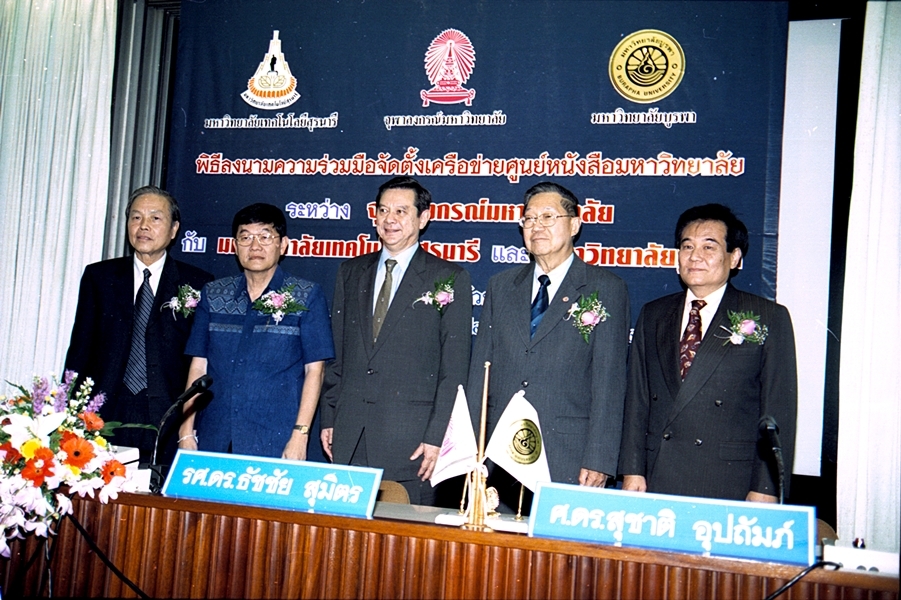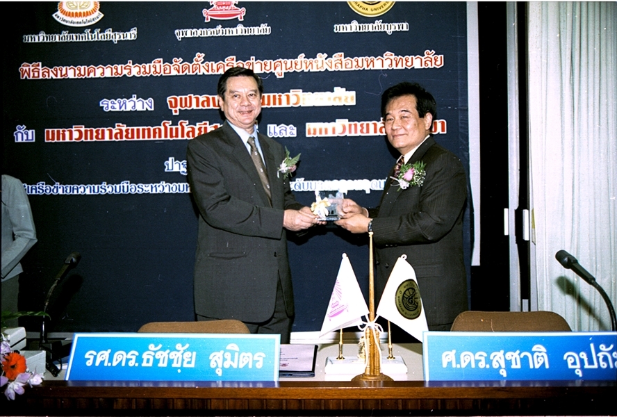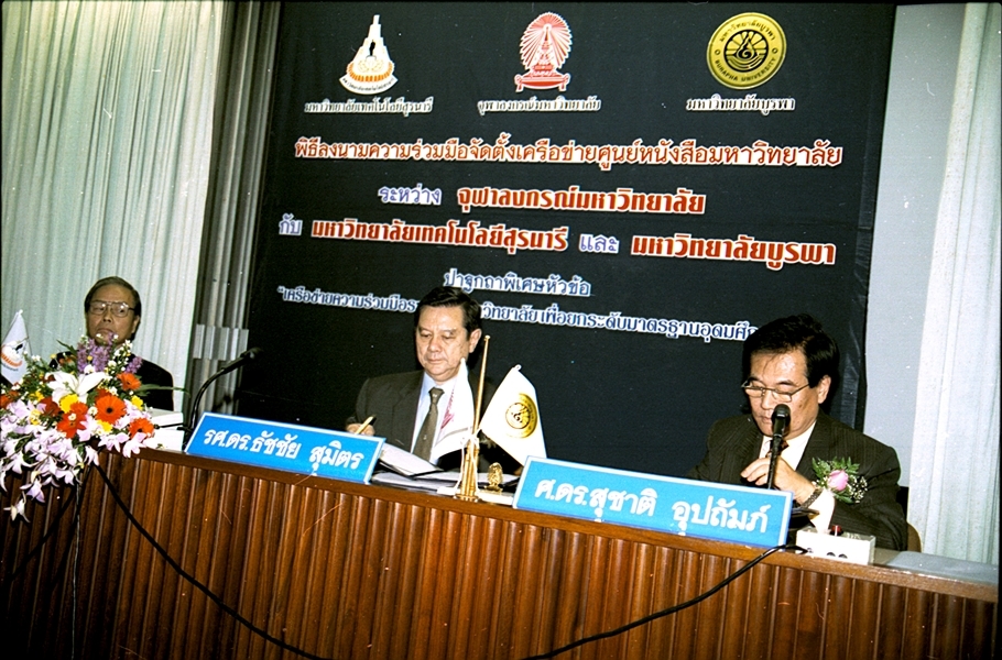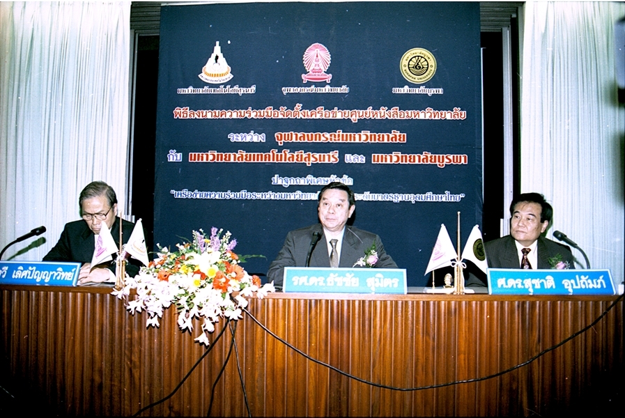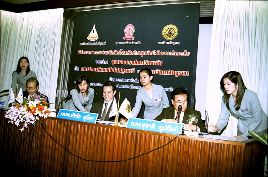พิธีลงนามบันทึกข้อตกลงความร่วมมือทางวิชาการจัดตั้งเครือข่ายศูนย์หนังสือมหาวิทยาลัย ระหว่าง มหาวิทยาลัยเทคโนโลยีสุรนารี และ มหาวิทยาลัยบูรพา เมื่อวันที่ 27 กันยายน พ.ศ. 2546