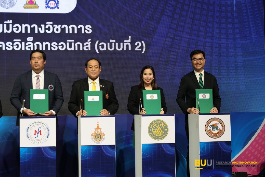 พิธีลงนามบันทึกข้อตกลงความร่วมมือทางวิชาการ ในการส่งเสริมและสนับสนุนทางวิชาการด้านไมโครอิเล็กทรอนิกส์ มหาวิทยาลัยบูรพา โดยมีรองศาสตราจารย์ ดร.จิตติมา เจริญพานิช รองอธิการบดีฝ่ายวิจัยและนวัตกรรม มหาวิทยาลัยบูรพา เป็นผู้แทนมหาวิทยาลัยบูรพา พร้อมด้วย ผู้ช่วยศาสตราจารย์ ดร.ณัฐพล ชมแสง รองคณบดีฝ่ายวิจัยบริการวิชาการและนวัตกรรม และผู้ช่วยศาสตราจารย์ ดร.อานุภาพ บุญส่งศรีกุล คณะวิศวกรรมศาสตร์ ร่วมลงนามบันทึกข้อตกลงความร่วมมือทางวิชาการในการส่งเสริมและสนับสนุนทางวิชาการด้านไมโครอิเล็กทรอนิกส์ (ฉบับที่ 2) ระหว่าง สำนักงานการวิจัยแห่งชาติ (วช.) ร่วมกับ 11 หน่วยงาน ได้แก่ สำนักงานปลัดกระทรวงการอุดมศึกษา วิทยาศาสตร์ วิจัยและนวัตกรรม มหาวิทยาลัยเทคโนโลยีมหานคร มหาวิทยาลัยเทคโนโลยีราชมงคลธัญบุรี มหาวิทยาลัยเทคโนโลยีราชมงคลอีสาน มหาวิทยาลัยเทคโนโลยีสุรนารี มหาวิทยาลัยนเรศวร มหาวิทยาลัยบูรพา มหาวิทยาลัยศิลปากร มหาวิทยาลัยอุบลราชธานีและสถาบันเทคโนโลยีไทย-ญี่ปุ่น ในงาน “มหกรรมงานวิจัยแห่งชาติ 2567 (Thailand Research Expo 2024)” การลงนามความร่วมมือในครั้งนี้ เพื่อการขับเคลื่อนด้านการพัฒนากำลังคนการวิจัยและนวัตกรรม การแลกเปลี่ยนเรียนรู้ รวมไปถึงการบริหารจัดการทรัพยากรที่สนับสนุนด้านไมโครอิเล็กทรอนิกส์สร้างความร่วมมือในการส่งเสริมและสนับสนุนทางวิชาการด้านไมโครอิเล็กทรอนิกส์เพื่อให้เกิดประโยชน์สูงสุดของประเทศ เมื่อวันที่ 28 สิงหาคม พ.ศ. 2567