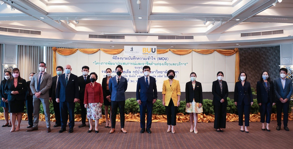 พิธีลงนามบันทึกข้อตกลงความร่วมมือทางวิชาการขับเคลื่อนโครงการพัฒนาประสบการณ์และอาชีพด้านท่องเที่ยวและบริการในภาคตะวันออก ระหว่าง มหาวิทยาลัยบูรพา กับ รอยัล คลิฟ โฮเต็ล กรุ๊ป นำโดยรองศาสตราจารย์ ดร.วัชรินทร์ กาสลัก อธิการบดีมหาวิทยาลัยบูรพา ลงนามบันทึกความเข้าใจ (MOU) ร่วมกับ คุณพงา วรรธนะกุล กรรมการผู้จัดการ และคุณวิทนาถ วรรธนะกุล กรรมการผู้บริหาร รอยัล คลิฟ โฮเต็ล กรุ๊ป เพื่อร่วมมือกันพัฒนาประสบการณ์และอาชีพด้านท่องเที่ยวและบริการสำหรับนิสิตมหาวิทยาลัยบูรพาและบุคลากรในอุตสาหกรรมการท่องเที่ยวในพื้นที่ภาคตะวันออก โดยคุณจิตรา จิตรา ใจเสือ ผู้ช่วยผู้จัดการฝ่ายทรัพยากรบุคคล รอยัล คลิฟ โฮเต็ล กรุ๊ป และผู้ช่วยศาสตราจารย์ ดร.พรรณี พิมาพันธุ์ศรี คณบดีคณะการจัดการและการท่องเที่ยว มหาวิทยาลัยบูรพา พร้อมด้วยผู้บริหารและบุคลากรจากทั้งสองหน่วยงาน ร่วมเป็นสักขีพยานในพิธีลงนามความร่วมมือ เมื่อวันที่ 20 เมษายน พ.ศ. 2565