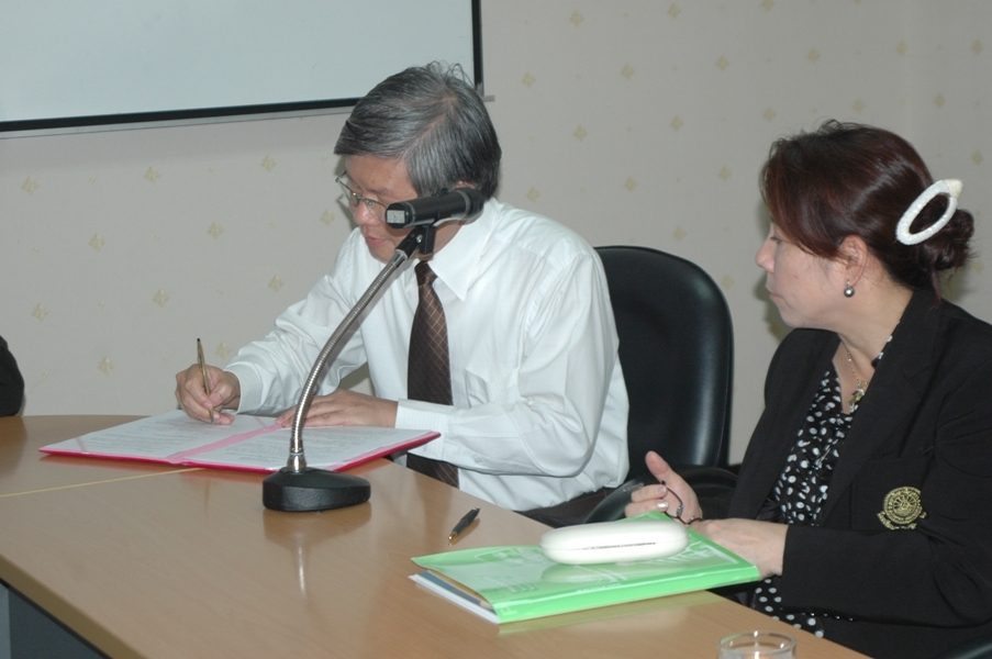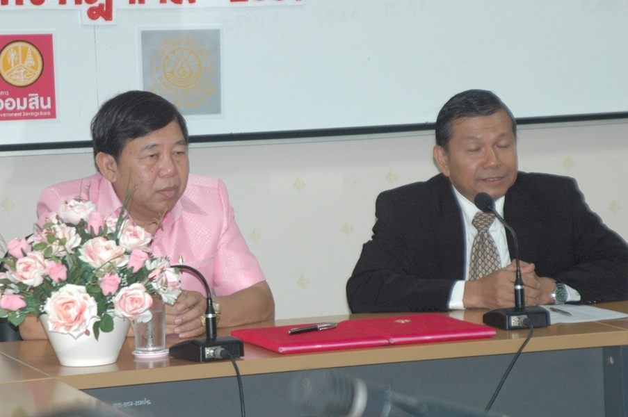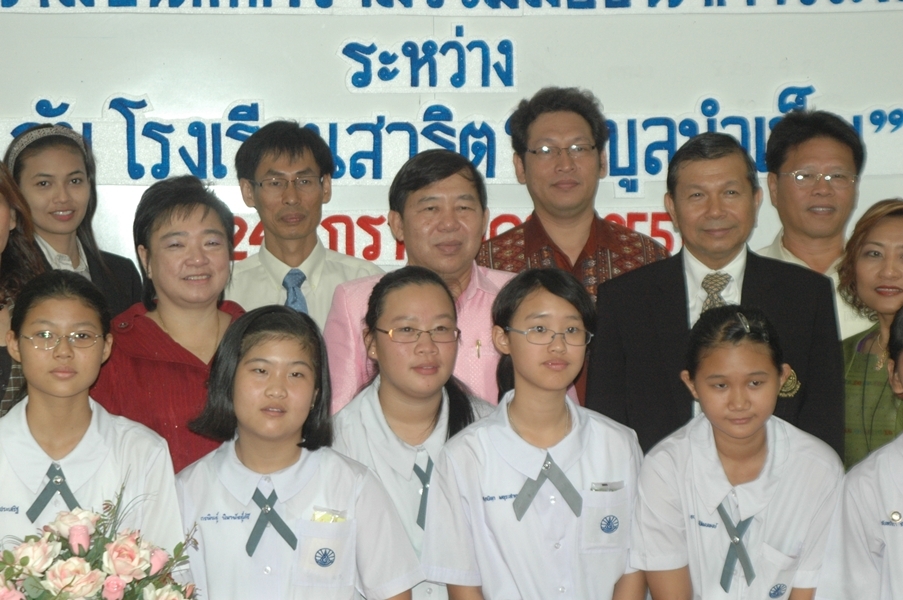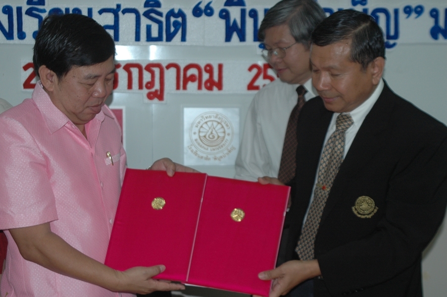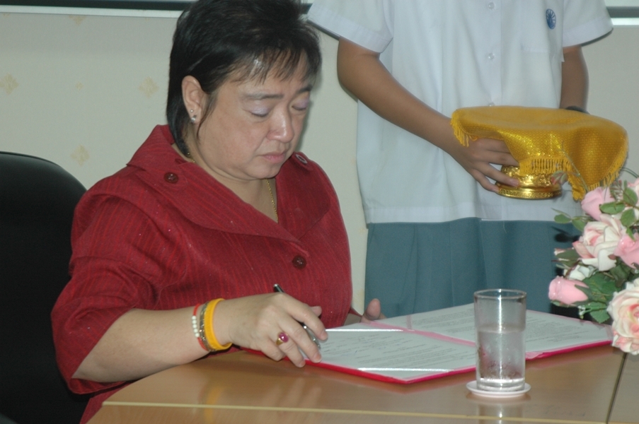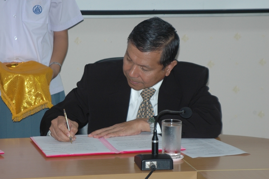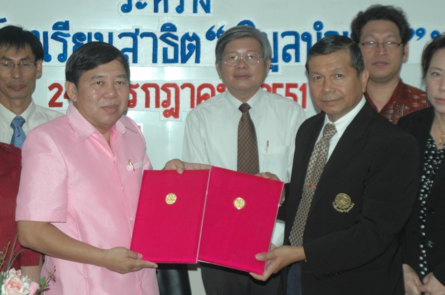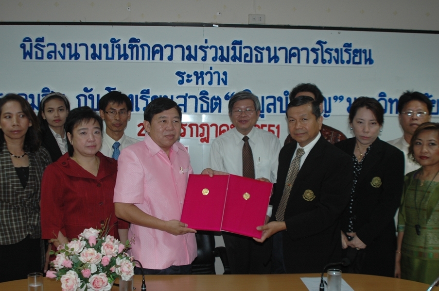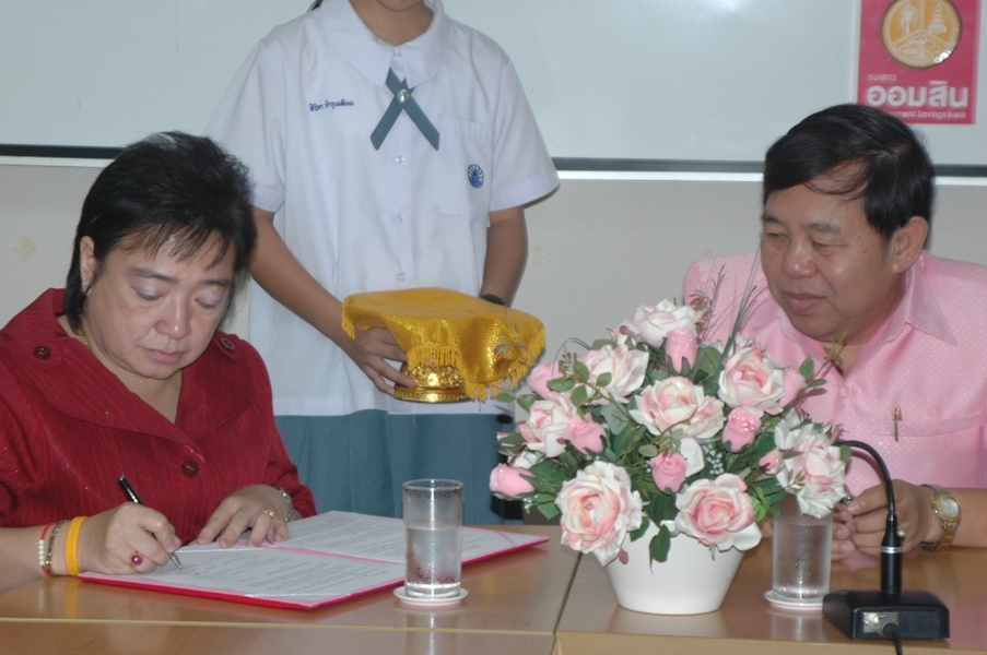 รองศาสตราจารย์ ดร.ฉลอง ทับศรี ผู้อำนวยการโรงเรียนสาธิต ฯ เป็นผู้ลงนามฝ่ายโรงเรียนสาธิต ฯ และนายสุวัฒน์ จันทรท่าจีน ผู้อำนวยการธนาคารออมสิน