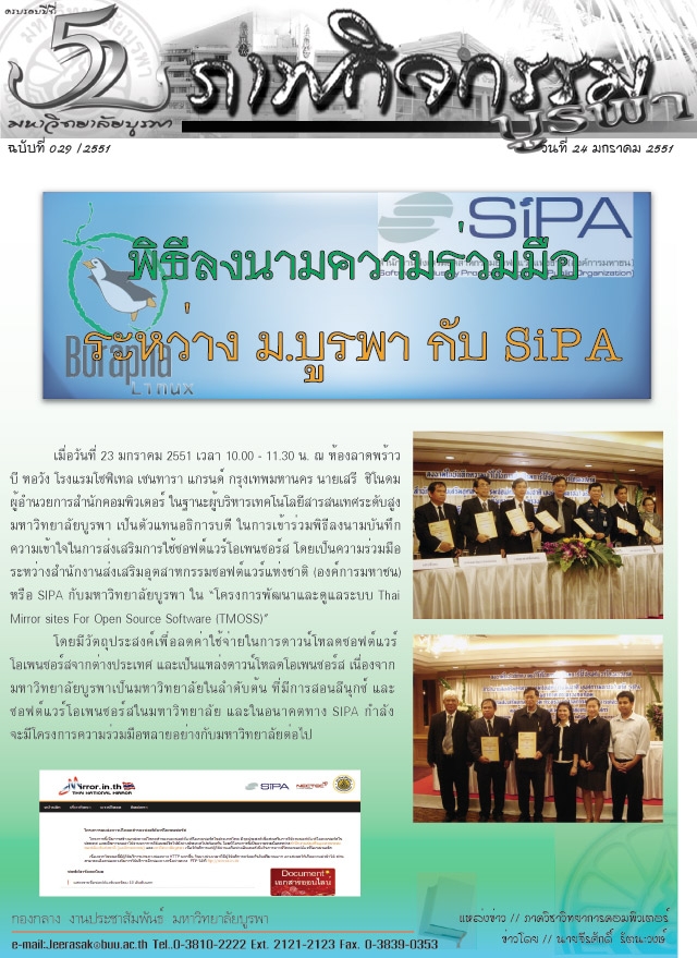 พิธีลงนามบันทึกข้อตกลงความร่วมมือทางวิชาการ ระหว่าง มหาวิทยาลัยบูรพา กับ SiPA นำโดยนายเสรี ชิโนดม ผู้อำนวยการสำนักคอมพิวเตอร์ ในฐานะผู้บริหารเทคโนโลยีสารสนเทศระดับสูงมหาวิทยาลัยบูรพา เป็นตัวแทนอธิการบดี ในการเข้าร่วมพิธีลงนามบันทึกความเข้าใจในการส่งเสริมการใช้ซอฟต์แวร์โอเพนซอร์ส โดยเป็นความร่วมมือระหว่างสำนักงานส่งเสริมอุตสาหกรรมซอฟต์แวร์แห่งชาติ (องค์การมหาชน) หรือ SIPA ใน “โครงการพัฒนาและดูแลระบบ Thai Mirror sites For Open Source Software (TMOSS)” โดยมีวัตถุประสงค์เพื่อลดค่าใช้จ่ายในการดาวน์โหลดซอฟต์แวร์ โอเพนซอร์สจากต่างประเทศ และเป็นแหล่งดาวน์โหลดโอเพนซอร์ส เนื่องจากมหาวิทยาลัยบูรพาเป็นมหาวิทยาลัยในลำดับต้น ที่มีการสอนลีนุกซ์ และซอฟต์แวร์โอเพนซอร์สในมหาวิทยาลัย และในอนาคตทาง SIPA กำลังจะมีโครงการความร่วมมือ