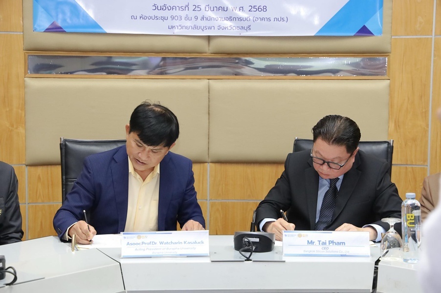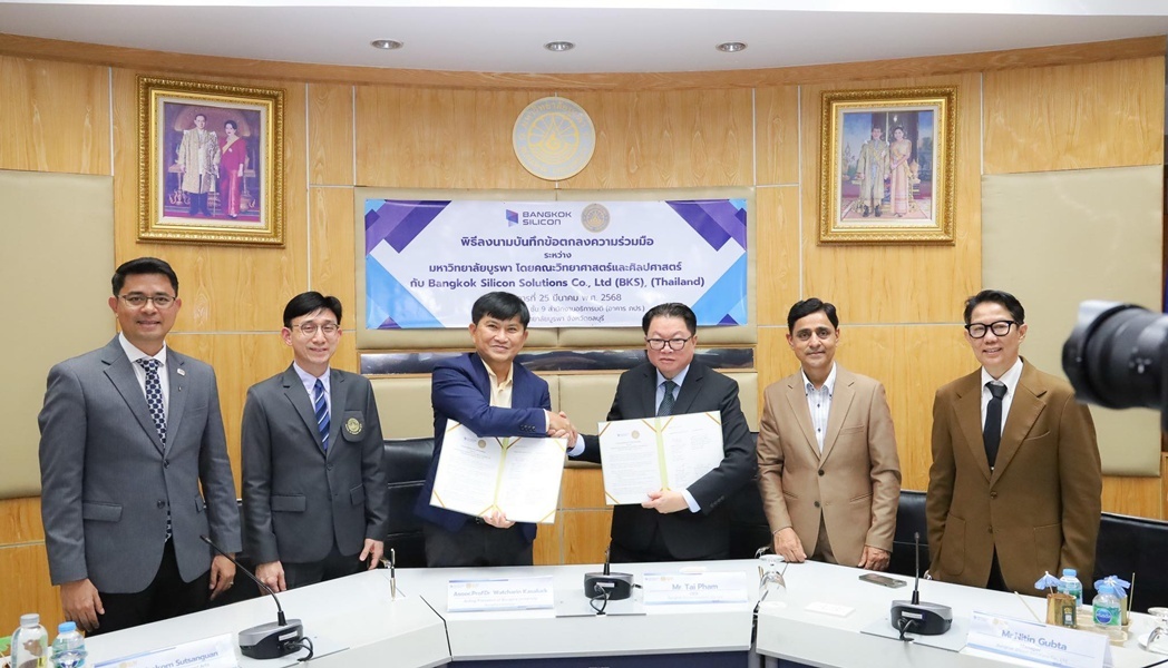 มหาวิทยาลัยบูรพา วิทยาเขตจันทบุรี จัดพิธีลงนามบันทึกข้อตกลงความร่วมมือ (MOU) กับบริษัท Bangkok Silicon Solutions Co., Ltd (BKS) เมื่อวันที่ 25 มีนาคม 2568 ณ มหาวิทยาลัยบูรพา เพื่อส่งเสริมความร่วมมือทางวิชาการและการวิจัยด้านเกษตรอัจฉริยะ โดยมุ่งเน้นการประยุกต์ใช้เทคโนโลยี IoT ปัญญาประดิษฐ์ (AI) และการวิเคราะห์ข้อมูลขนาดใหญ่ (Big Data) รวมถึงการพัฒนาระบบตรวจสอบย้อนกลับทางการเกษตร ความร่วมมือครั้งนี้ยังครอบคลุมการดำเนินโครงการวิจัยร่วม การแลกเปลี่ยนองค์ความรู้ ตลอดจนการสร้างโอกาสฝึกงานและพัฒนาศักยภาพนิสิต นักวิจัย และบุคลากรของทั้งสองฝ่าย อีกทั้งยังช่วยยกระดับบทบาทของมหาวิทยาลัยบูรพาในการเป็นที่ปรึกษาด้านวิชาการและเทคโนโลยีแก่ภาคอุตสาหกรรม ภายในพิธีมีผู้บริหารจากทั้งสองหน่วยงานร่วมลงนามและเป็นสักขีพยาน พร้อมหารือแนวทางความร่วมมือระยะยาว เพื่อพัฒนาองค์ความรู้และนวัตกรรมที่สามารถนำไปใช้ประโยชน์ได้ทั้งในระดับประเทศและนานาชาติ โดยปิดท้ายด้วยการมอบของที่ระลึกและถ่ายภาพร่วมกัน