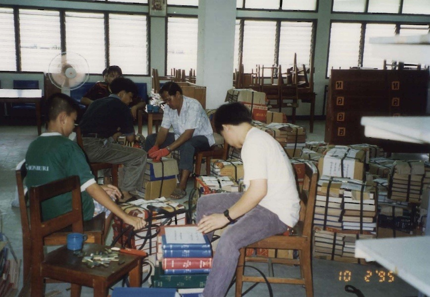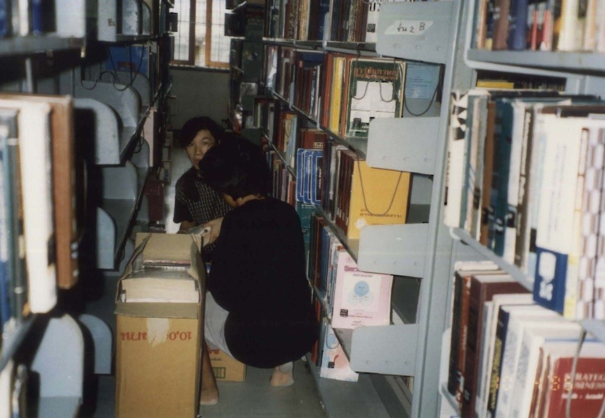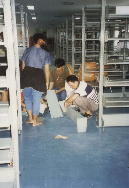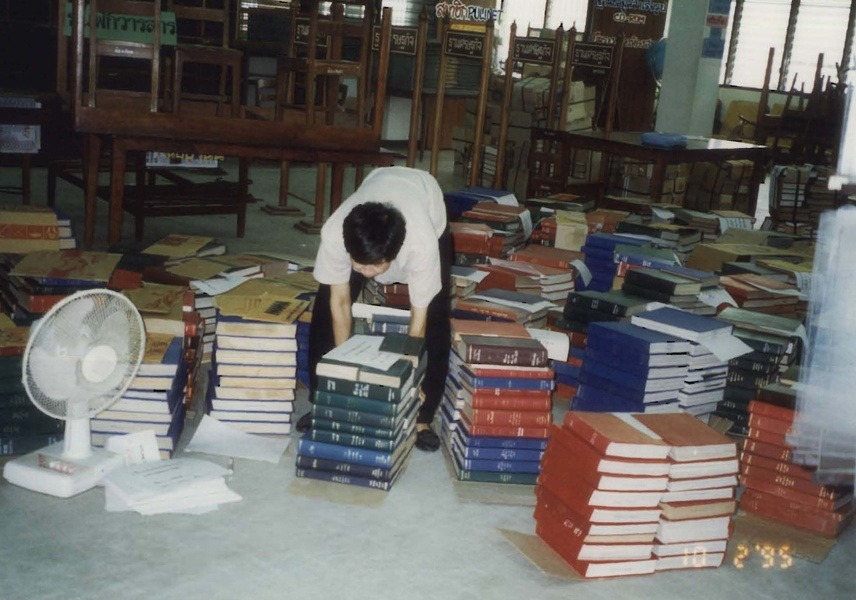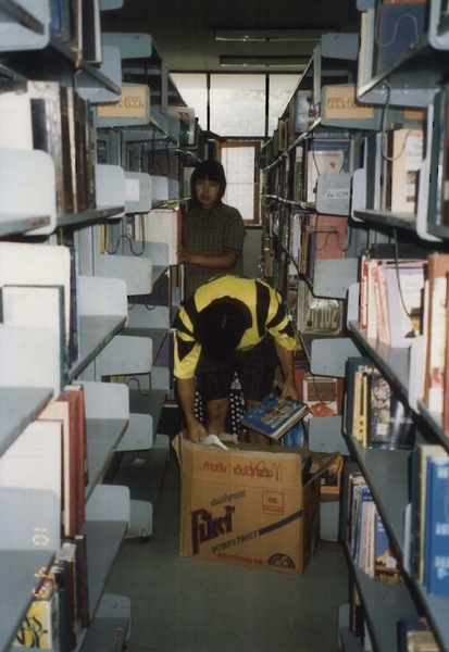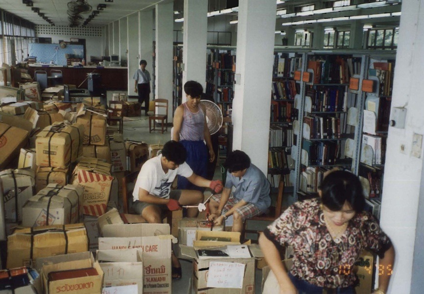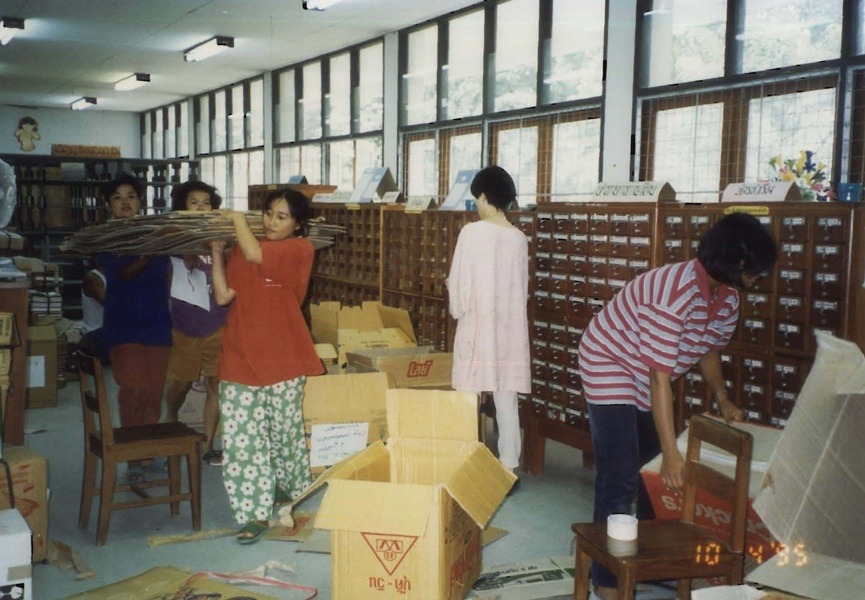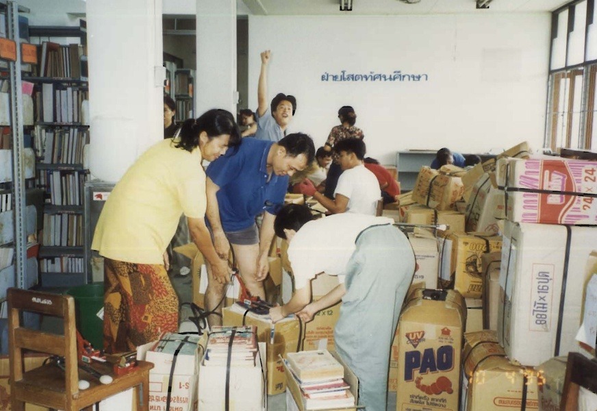 บรรยากาศบุคลากรร่วมแรงร่วมใจกันขนย้ายหนังสือจากชั้นเก็บเดิมบางส่วนลงกล่องหรือรถเข็น บางส่วนนำมามัด วางเรียงซ้อนกันอย่างเป็นระเบียบเพื่อรอการย้ายไปยังพื้นที่แห่งใหม่ที่กว้างขวางและสะดวกต่อการบริการกว่าเดิม พร้อมรองรับการเรียนรู้ในอนาคต เมื่อปี พ.ศ. 2538
