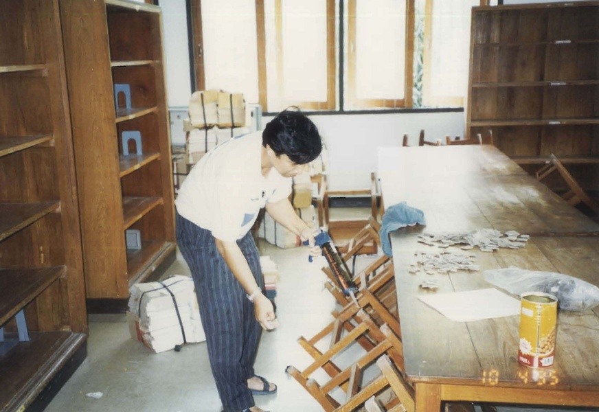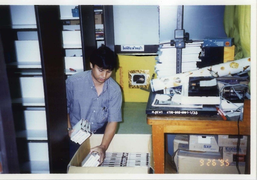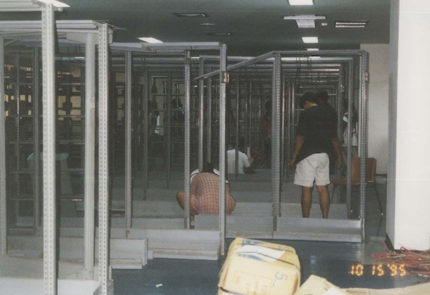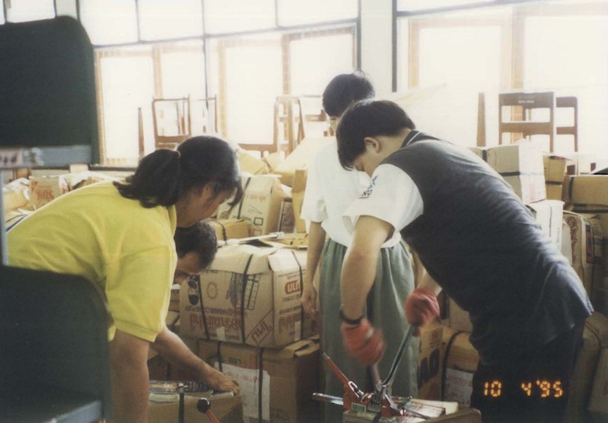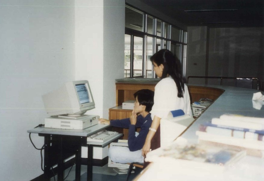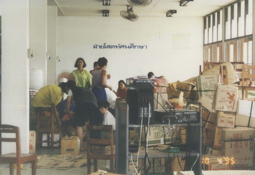บรรยากาศบุคลากรร่วมแรงร่วมใจกันขนย้ายหนังสือจากชั้นเก็บเดิมบางส่วนลงกล่องหรือรถเข็น บางส่วนนำมามัด วางเรียงซ้อนกันอย่างเป็นระเบียบเพื่อรอการย้ายไปยังพื้นที่แห่งใหม่ที่กว้างขวางและสะดวกต่อการบริการกว่าเดิม พร้อมรองรับการเรียนรู้ในอนาคต เมื่อปี พ.ศ. 2538