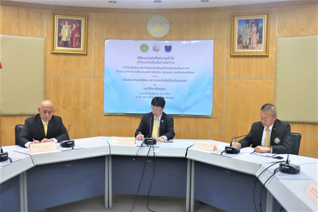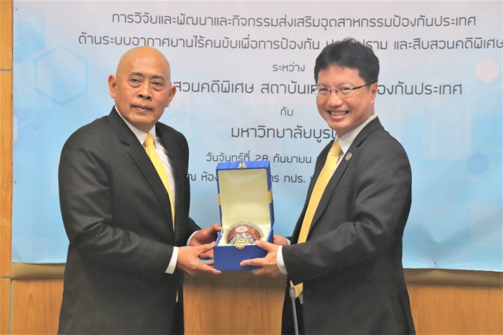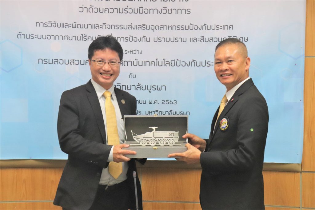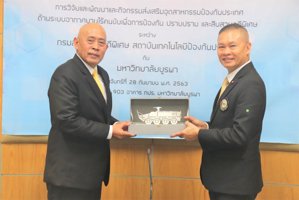 พิธีลงนามบันทึกข้อตกลงความร่วมมือทาวิชาการ ความเข้าใจว่าด้วยความร่วมมือทางวิชาการ “การวิจัยและพัฒนา และกิจกรรมส่งเสริมอุตสาหกรรมป้องกันประเทศด้านระบบอากาศยานไร้คนขับเพื่อการป้องกัน ปราบปราม และสืบสวนสอบสวนคดีพิเศษ” ระหว่าง คณะวิศวกรรมศาสตร์ มหาวิทยาลัยบูรพา กรมสอบสวนคดีพิเศษ และสถาบันเทคโนโลยีป้องกันประเทศ นำโดยมีผู้ช่วยศาสตราจารย์ ดร.ณยศ คุรุกิจโกศล ผู้รักษาการแทนรองอธิการบดีฝ่ายกิจการเขตพัฒนาพิเศษภาคตะวันออกคณบดี/ คณะวิศวกรรมศาสตร์ มหาวิทยาลัยบูรพาพันตำรวจโทกรวัชร์ ปานประภากร อธิบดีกรมสอบสวนคดีพิเศษ (DSI) และพลอากาศเอก ดร.ปรีชา ประดับมุข ผู้อำนวยการสถาบันเทคโนโลยีป้องกันประเทศ เป็นผู้แทนหน่วยงานลงนามพร้อมด้วยพันตำรวจโทปกรณ์ สุชีวกุล รองอธิบดีกรมสอบสวนคดีพิเศษ พลตรี ดร.ชรัติ อุ่มสัมฤทธิ์ รองผู้อำนวยการสถาบันเทคโนโลยีป้องกันประเทศ และดร.สัญชัย เอียดปราบรองคณบดีฝ่ายพัฒนานิสิต คณะวิศวกรรมศาสตร์ มหาวิทยาลัยบูรพา ร่วมลงนามเป็นพยานในครั้งนี้ด้วย เพื่อร่วมมือทางวิชาการการวิจัยและพัฒนา และกิจกรรมส่งเสริมอุตสาหกรรมป้องกันประเทศด้านระบบอากาศยานไร้คนขับ โดยมุ่งเพิ่มขีดความสามารถใน การบริหารจัดการและการบูรณาการด้านวิชาการตลอดจนการวิจัยและพัฒนาด้านระบบอากาศยานไร้คนขับ ซึ่งดำเนินการวิจัยและพัฒนาเทคโนโลยีระบบอากาศยานไร้คนขับภายใต้แผนที่นำทางโครงการวิจัยและพัฒนาระบบอากาศยานไร้คนขับของ สทป. รวมถึงการแลกเปลี่ยนองค์ความรู้ ทรัพยากร และบุคลากรร่วมกัน และการนำเทคโนโลยีมาบูรณาการงานด้านป้องกัน ปราบปราม และสืบสวนสอบสวนคดีพิเศษ ตลอดจนการรับผิดชอบต่อสังคมร่วมกัน เมื่อวันที่ 28 กันยายน พ.ศ. 2563 ณ ห้องประชุม 903 ชั้น 9 สำนักงานอธิการบดี (อาคาร ภปร) มหาวิทยาลัยบูรพา